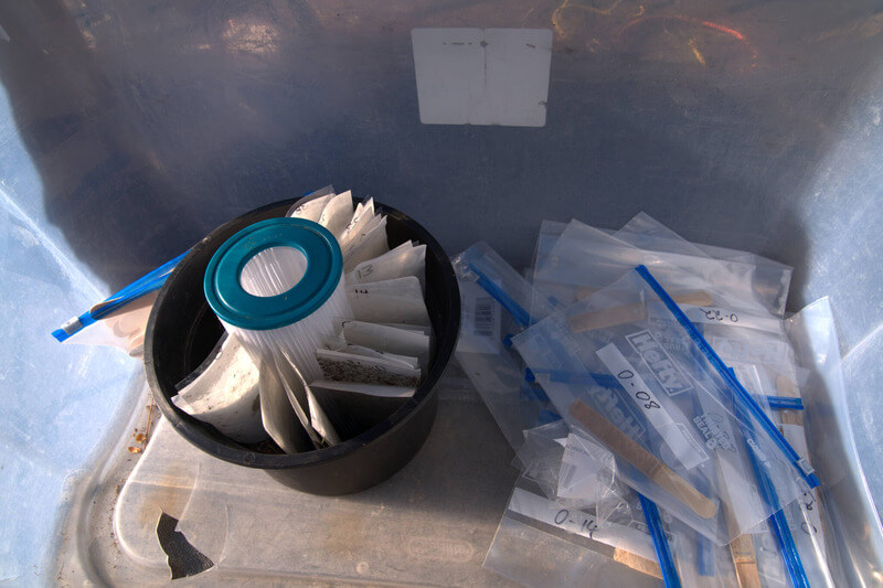 Garrett plucks out the sticky papers that have been inside the traps for the previous week, replaces them with clean sticky papers and adds a bit of fresh water. He’ll take the samples back to the lab to count how many Aedes aegypti they snagged.