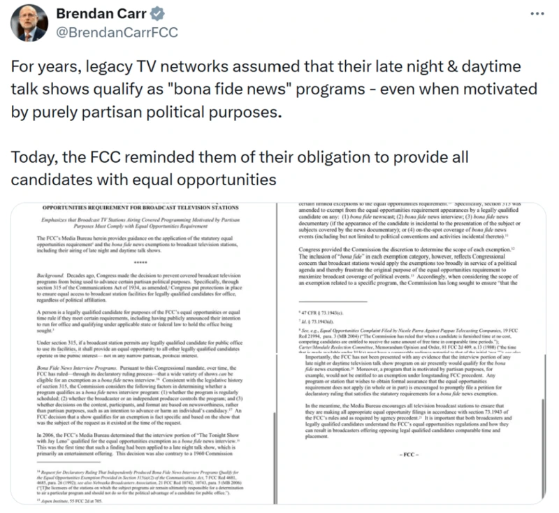 FCC Chairman Brendan Carr recently signaled he was considering eliminating the talk-show exemption, arguing that some programs are “motivated by partisan purposes.”