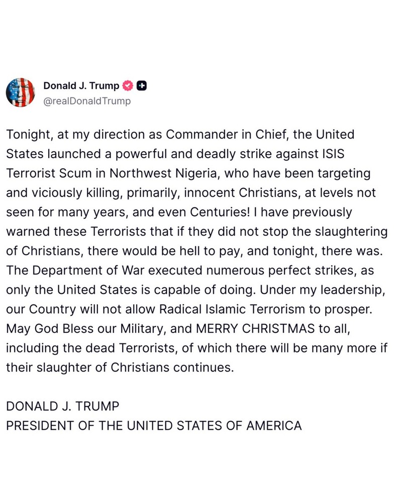 President Trump posted on his platform that “tonight, at my direction as Commander in Chief, the United States launched a powerful and deadly strike against ISIS Terrorist Scum in Northwest Nigeria, who have been targeting and viciously killing, primarily, innocent Christians.” He added that “there will be many more [dead terrorists] if their slaughter of Christians continues.”