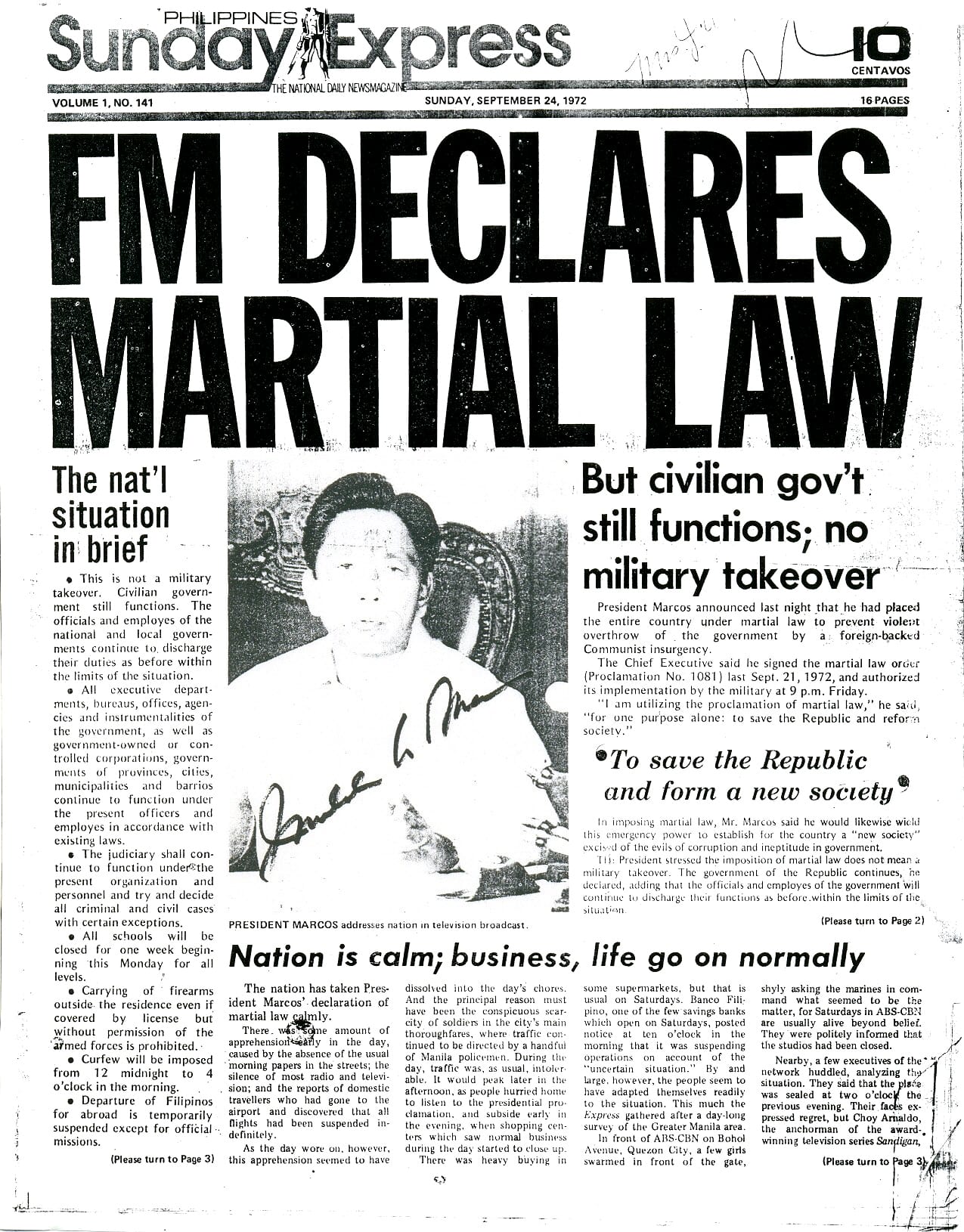 A notable example is the martial law declared in the Philippines in the 1970s under President Ferdinand Marcos.