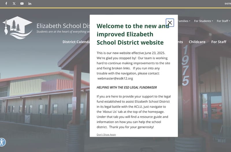 The first thing visitors to the Elizabeth School District website see is a pop-up window with an unusual message: an invitation to help cover legal fees incurred in a lawsuit over library book removals.