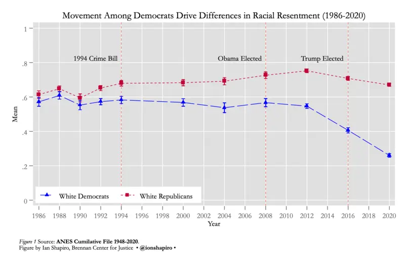 Research from the Brennan Center for Justice, which examined attitudes from 1984 to 2020, found that racial resentment is significantly more prevalent on the political right than the left.
